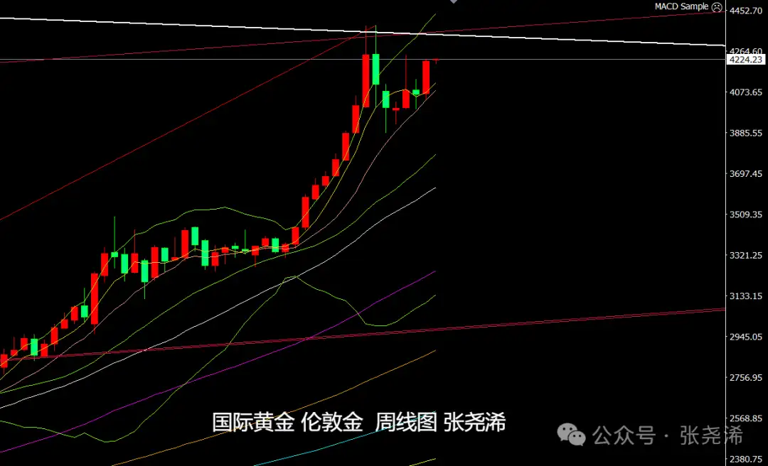 具体走势上,金价自周初开于4067.47美元/盎司,先行录得当周低点4040.02美元,之后强势反弹打破近期震荡格局,多头力量增强,随后有连续震荡上行,并在周五多头再度拉升,录得当周高点4226.59美元,最终持稳收于4217.40美元,周振幅186.57美元,收涨149.93美元,涨幅3.69%。