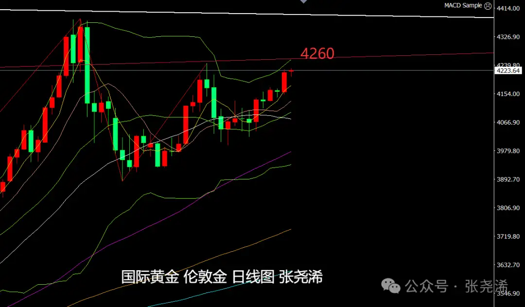日图;金价自筑底布林带中轨支撑盘整后,多头反弹拉升走强,目前30日等众多均线已转为支撑,布林带也开口向上延伸,多头前景加大,附图指标也维持看涨信号发展,短期方向将仍以看涨反弹为主,下方关注5日均线支撑附近仍以看涨为主,继续等待上探4260美元或4380美元目标。