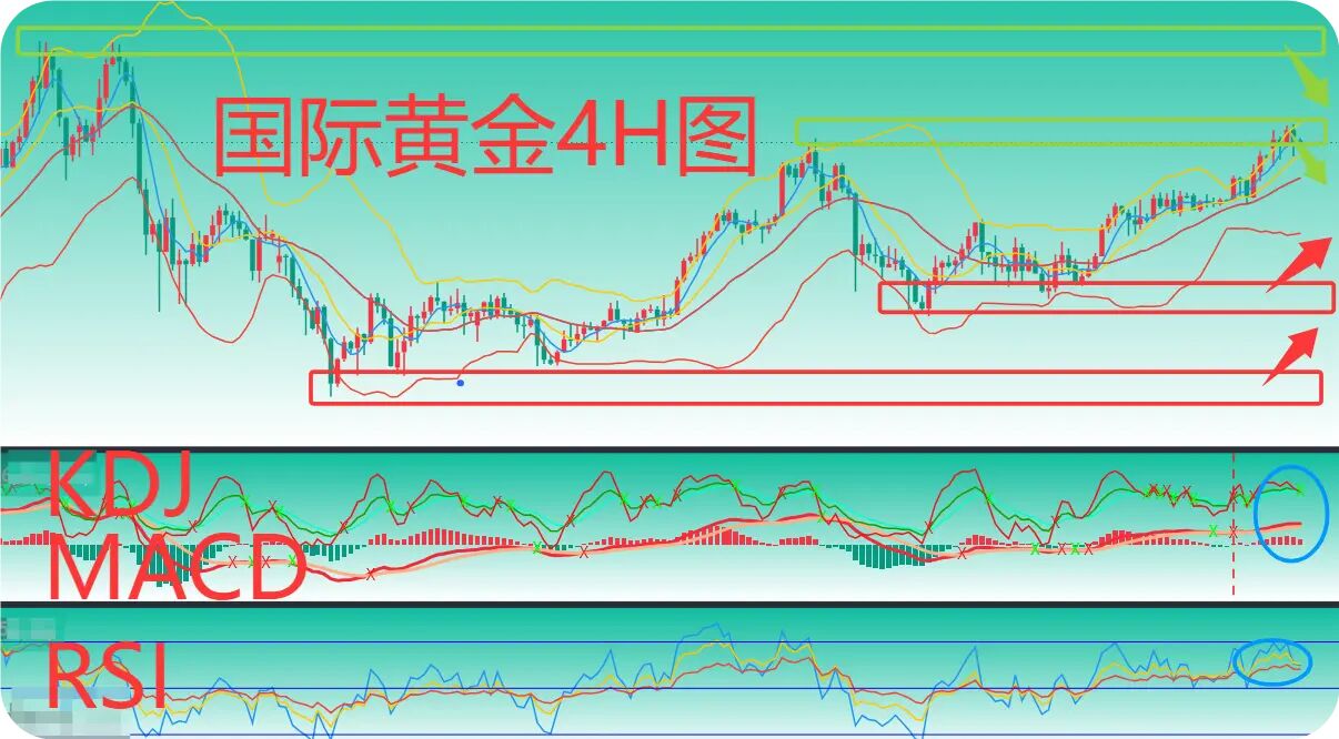❷:4小时级别上:布林带开口扩张,金价在布林带上轨附近运行;MACD技术指标金叉运行中,RSI技术指标强势上升状态,金价上涨动能强势;