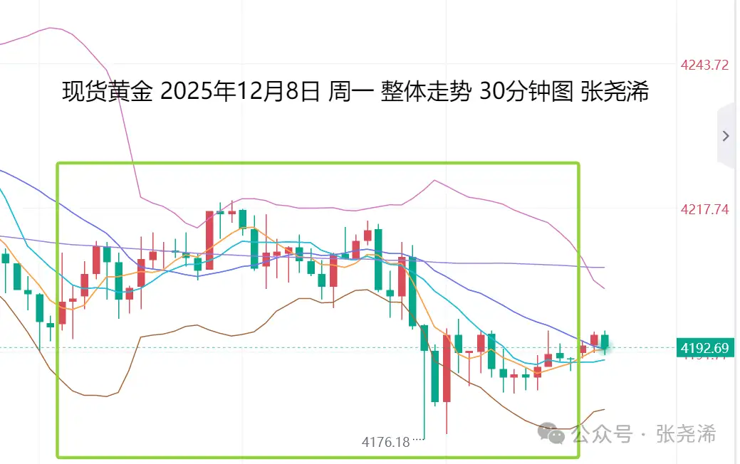 上交易日周一(12月8日):国际黄金震荡收跌,维持偏弱调整,受到上周五的回撤压力,以及市场对于美联储本周或鹰派降息而推动美元指数止跌走强的打压;但整体仍维持在中轨支撑上方,以及近期的回升趋势中,暗示后市仍有再度走强攀升的预期,如回撤触及中轨及30日均线等支撑,也仍是继续看涨入场的机会。