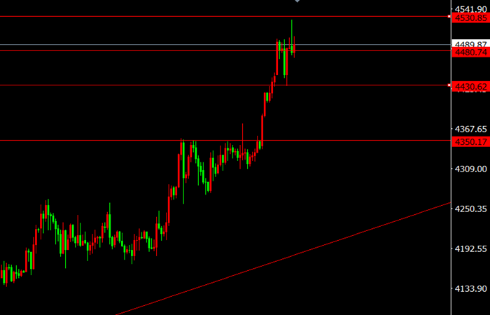 周三现货黄金突破4500关口后有所回落,这股涨势不仅受到了地缘政治紧张局势、美联储降息预期以及美元走软等多重因素的推动,还叠加了工业需求强劲和央行买盘活跃的影响。技术面本周金价已上行200美金左右,早盘快速冲高回落,短线来看有明显承压迹象,稳健关注4480以及4430支撑的有效性,激进思路先行看回撤!