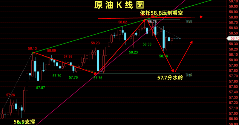多单:激进57.7±0.2区间,稳健57.0±0.2区间,止损:各0.6左右,目标位:58.8附近!