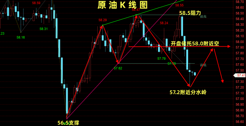 多单:激进57.0±0.2区间,稳健56.6±0.2区间,止损:各0.6左右,目标位:58.0附近!