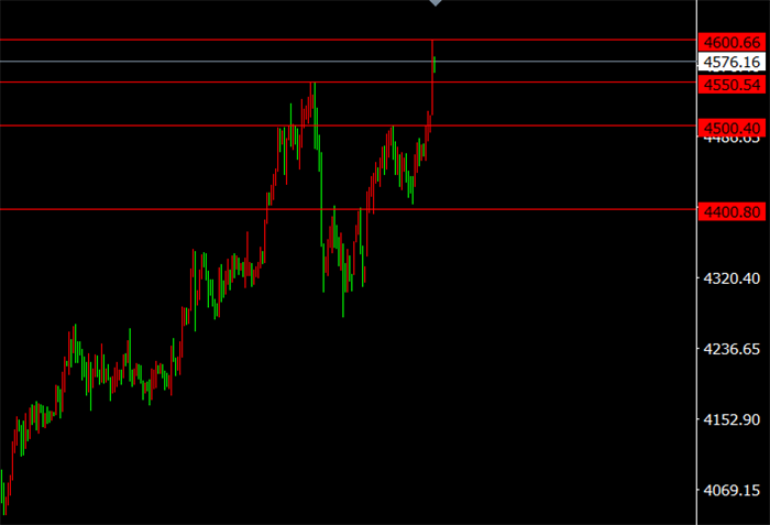地缘政治风险的急剧上升,直接刺激了避险资产需求,推动现货黄金周一价格强势上涨,延续前两个交易日涨势,一度触及4600的历史新高,现交投于每盎司4570美元附近。技术面早盘金价急涨再创新高,短线伴随着快速回调,右侧耐心等待回调测试4550支撑情况,左侧我们暂时观望等待1月20日在做布局。