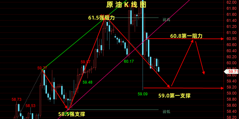 多单:激进59.2±0.2区间,稳健58.5±0.2区间,止损:各0.6左右,目标位:61.8附近!