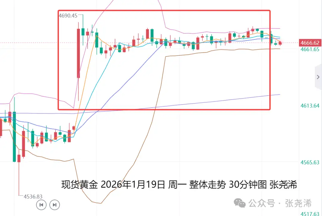 上交易日周一(1月19日):国际黄金受美国总统特朗普在格陵兰岛争端中对多个欧洲国家发出加征关税警告所激发的避险需求推动,高开高走,再度收阳,维持多头看涨前景,但目前走势触及上升趋势线压力附近,也有短线回落调整的需求,不过,如有回撤调整,下方各短周期均线支撑,也是再度入场看涨的机会,反之,如继续反弹走强收阳至趋势线阻力上方,则将顺势跟进继续看涨上行。
