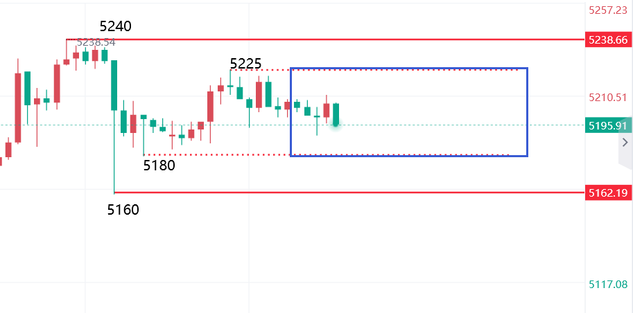 今天我们重点关注两个关键位置:上方压力带在5225美元,也就是昨天的高点位置,也是今天的高点;下方支撑则看5180支撑,以及夜间回撤低点5160支撑。晚间黄金建议在5160-5200这个区间内,采取高空低多。