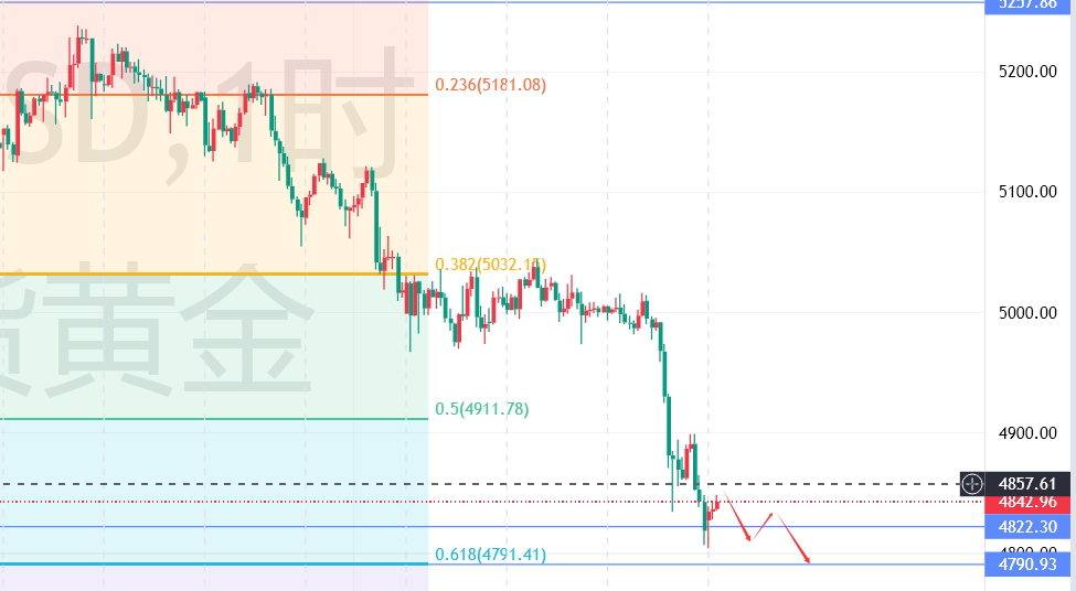 支撑与阻力区分明确:下方核心支撑聚焦4800美元整数关口,该位置是短期空头趋势的阶段性支撑,若跌破该位置,金价将加速下探,直接向4780美元区间靠拢;上方短期阻力关注4880-4900美元区间,该区间是当前震荡整理的上沿,也是前期下跌过程中的短暂整理点位,同时受5日均线压制,反弹至该区间附近大概率会遭遇空头压制,难以有效突破。
