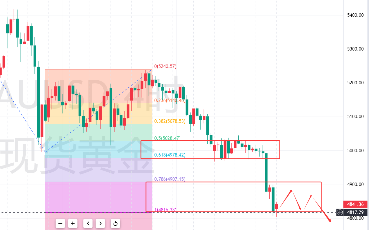 技术面解析:黄金昨天在5015-4980区间震荡后突发下破,日线级别,金价经连续两日十字星修正后,收出大阴线强势破位,跌破所有关键支撑,均线形成标准空头排列,下行通道打开,空头趋势正式确立且势头强劲。指标方面,MACD死叉向下发散、绿柱动能放大,空头力量持续释放;KDJ跌至超卖区,暗示短期有微弱反弹需求,但仅为弱势修正,无法扭转下行格局。黄金目前最低触及4805附近。单边重挫,一泻千里,空头来势汹汹,多头溃不成军,创下近期最大单日跌幅。将有可能继续挑战前期的低点位置4782附近,到达季线的位置4730左右,今日黄金仍然偏向于空头思路。