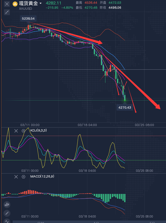 周一(3月23日) 现货黄金震荡下行, 现交投于每盎司4291美元附近,日内跌幅约4.6%。尽管金价在4300美元附近获得一定支撑,但任何有意义的反弹仍显得遥不可及。过去四周黄金累计跌幅已超8%,从近期高点5300美元上方大幅回落,显示市场对避险需求的重新定价与高利率环境双重压制。