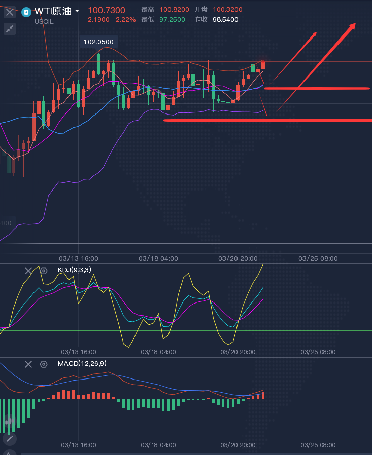 原油的周线月线,在经过前面的大起大落后仍是一个修复状态,参考意义不大,重点看一下日线级别的走势,日线现在维持高位震荡, 周五的调整没有出现,再度反弹了起来,也就意味着原油将继续震荡上行,接下来可能迎来一轮新的上涨!