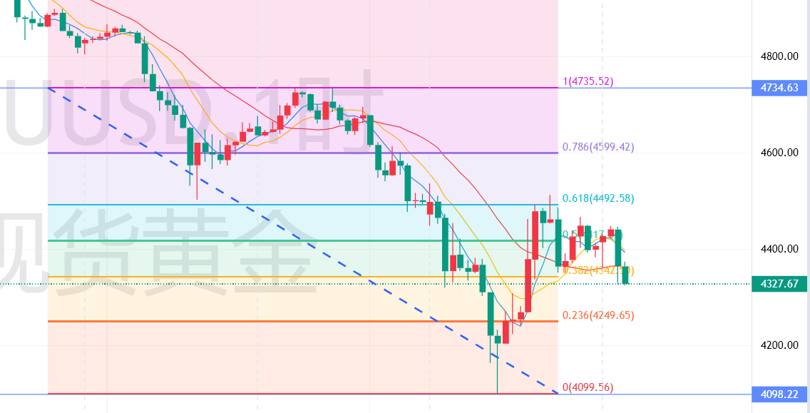 日线级别,急跌后反弹但未形成有效突破,K线呈现震荡整理态势,未形成持续连阴或连阳格局,均线空头排列有所缓解但仍有压制,金价在均线区间内震荡,凸显多空犹豫;四小时级别,走势呈现“急跌-反弹-回落”的拉锯格局,打破此前阶梯式下跌,MACD绿柱缩量后又有小幅放量迹象,KDJ指标在超卖区拐头后未能持续上行,显示短期动能不足,涨跌切换频繁;小时线表现最为明显,反弹后快速回落、回调后迅速企稳,无持续单边走势,MACD指标在零轴下方反复震荡,绿柱与红柱交替出现,未形成有效趋势共振,完美契合“涨跌不延续”的短期特征。