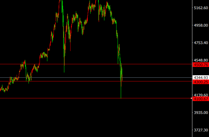 周一黄金上演V型反转,特朗普对伊朗发出打击最后通牒,引发通胀恐慌,金价一度暴跌超8.7%至4099美元;随后特朗普宣布推迟打击5天,油价崩跌、美元回落,金价快速反弹,最终仅收跌约2%。目前黄金因中东局势缓和、油价大跌及美元走强承压下行,短期空头占优,4300附近有短线支撑,4500上方压力较强;操作上建议反弹轻仓做空,严格关注地缘政治与美联储动向。