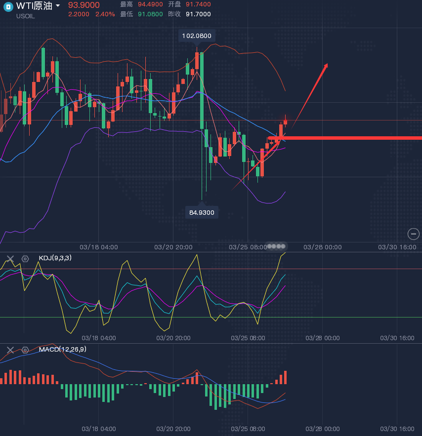 四小时方面,原油震荡反弹重新站稳了中轨,短线走势由弱转强,那么今日中轨91.5也从阻力转换为今日的支撑,也是今天入场做多的位置,近期原油受局势影响较大, 我们也要跟着局势去变化,在通过技术面去确定入场位置!