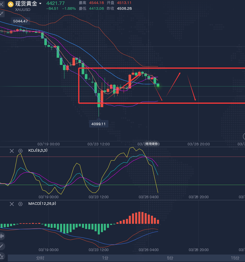 黄金昨日冲高回落,虽然是保持收阳状态,但上影线较长,再加上并没有站稳5日线,反弹明显减弱了,因此这波从4100-4600,500个点的反弹空间, 我认为差不多了,短线不适合再 追高了,再加上特朗普的打击行动推迟五天,缓兵之计的这个时间窗口也快到了,不管打不打,只要局势不缓和,黄金还得跌, 甚至不排除局势升温出新低的可能!所以今天短线的思路以看跌为主。