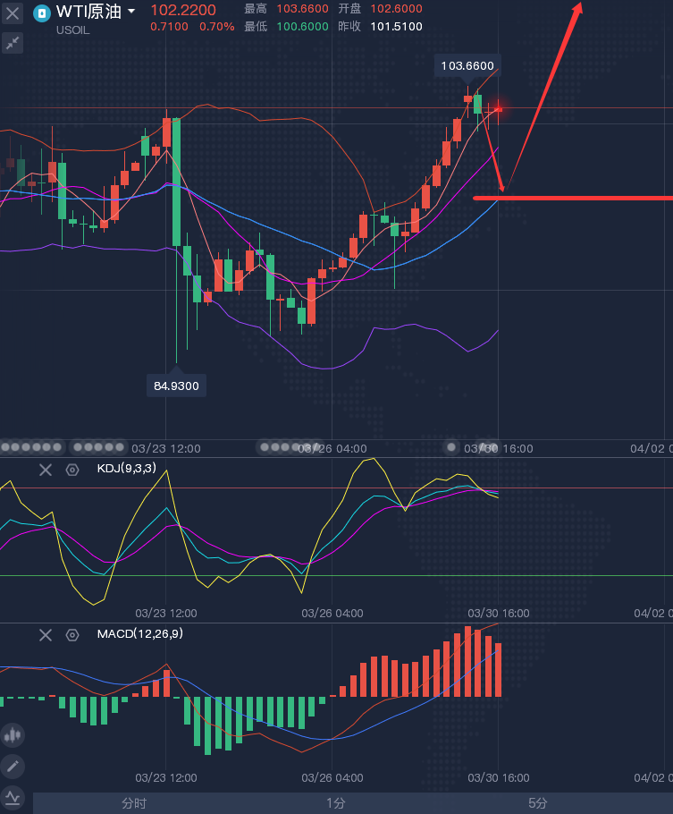 原油上周同样是收了很长的下影线, 这进一步增加了上涨的预期, 在局势没有缓和的情况下,高油价以及上涨趋势还会延续,下一目标就是月初高点119.5附近了,届时待美伊冲突升级后,涨到150也不是不可能,因此本周依旧看好原油上涨!