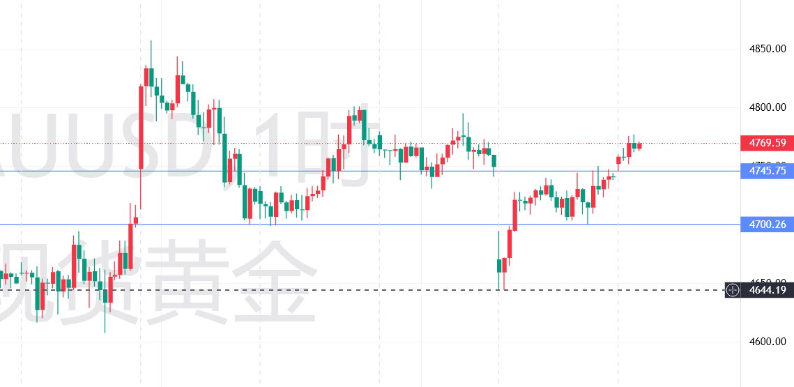 小时级别:金价维持震荡上行的短线节奏,全程以横盘整理代替深度回调,属于强势行情的典型走法,多次下探关键支撑位后快速拉升收复失地,下方买盘承接力度极强。短期MA5、MA10均线粘合向上,形成即时支撑,短线支撑位集中在4758-4762区间。附图指标MACD金叉运行,红色动能柱温和放量,短线多头动能尚存;KDJ指标高位略有钝化,预示短线存在小幅回调整理需求,但难以改变整体多头趋势,只需关注支撑位企稳情况,即可把握短线进场机会。