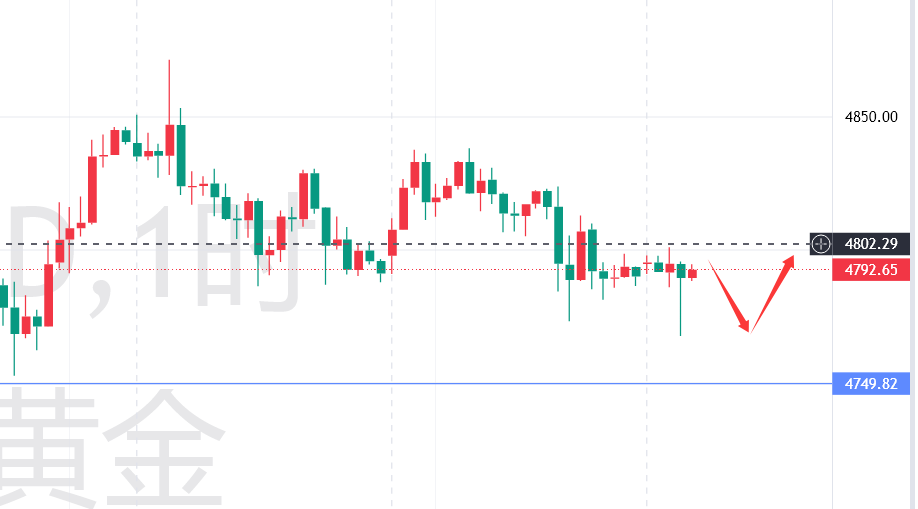 四小时级别来看,走势与日线形成呼应,价格从高位回落之后进入震荡下行通道,整体重心逐步下移。短期均线系统呈现空头排列状态,5 周期与 10 周期均线持续向下发散,对金价反弹形成明显压制,每次反弹触及均线位置均遇阻回落,短线空头相对占优。从形态上看,金价在 4800 上方构筑出阶段性小平台压力,多次上攻均未能实现有效突破,随后回落跌破前期震荡区间下沿,目前处于回踩确认阶段。指标方面,MACD 双线运行于零轴下方,绿柱有所放量,说明空头动能仍在释放;KDJ 指标在低位区域有所粘合,虽有形成金叉的迹象,但反弹力度较弱,难以改变当前震荡偏弱的格局。四小时级别关键支撑集中在近期低点附近,该位置也是前期上涨过程中的重要整理平台,具备一定的买盘支撑;