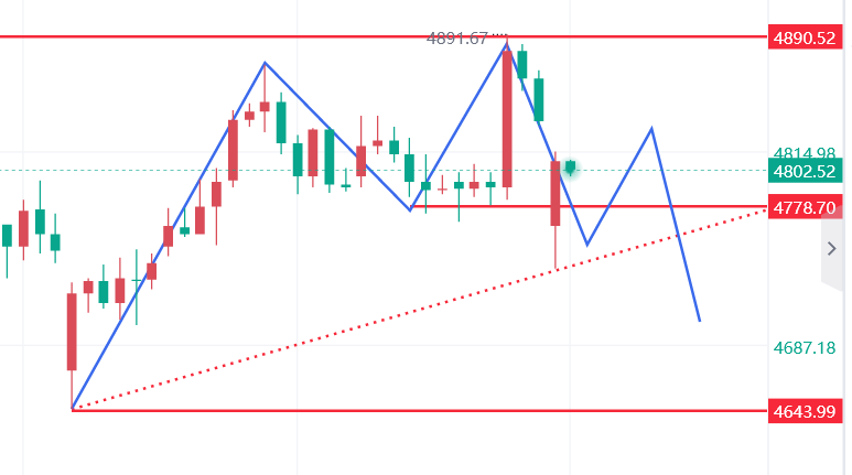 从黄金4小时来看:黄金已跌破短期上升趋势线,进入调整通道,动能指标转弱。若反弹无法重回4850美元上方,短线大概率维持震荡偏弱;但若在支撑区域企稳,不排除再度测试前期高位的可能。当前黄金仍处于强势震荡格局,大区间延续上周的4650—4900美元,只要该区间未被打破,本周大概率难还是很难出现单边行情。