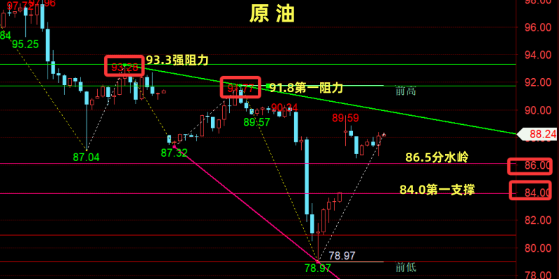 个人建议:激进反弹91.5±2空,稳健等93.0附近再空,破94.0损,目标86.5破位持有!