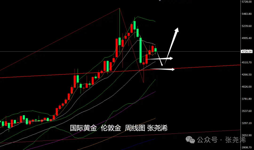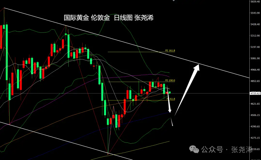 日图级别,金价目前在持续运行在60日均线下方的同时,还再度运行在短期均线下方,空头占据优势,下方将重点关注中轨线支撑,跌破此支撑则有望回撤至4500美元或者4400美元关口,反弹至反弹突破60日均线阻力,则有望进一步触及5000美元关口,并加大再度刷新历史高点的预期。