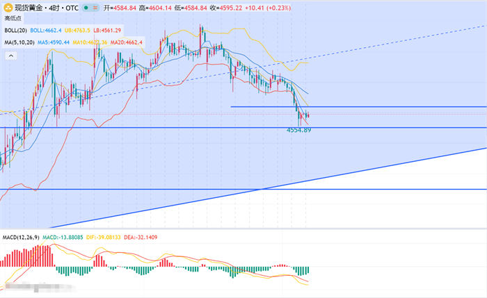 周三亚盘现货黄金交投于4595美元/盎司附近,昨日金价回落近2%,一度跌至四周最低至4554美元/盎司,因特朗普对伊朗关于结束战争的最新提议感到不满,削弱了冲突解决的希望,同时阿联酋宣布退出OPEC及OPEC+,进一步推升油价并重燃通胀担忧。技术面4小时延续下跌后弱势横盘,反弹无力无反转形态,布林带下轨承压、均线空头层层压制,MACD空头绿柱小幅缩减却未形成金叉反转,整体震荡偏弱,短线操作围绕4620-4550区间先行看回撤。