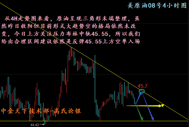 日线上看虽然昨日收阳,但今日空头趋势格局依然未改变,四小时目前受布林中轨45.55承压作用,下跌通道之中保持良好。每次的反抽高点在下降。形成4小时结构图的台阶下跌通道。现在次高点就在45.7一线。昨日反抽确认但还是在弱势空间之中运行,45.7的短线阻力也开始显现。那么今天操作思路就比较明显。还是依托45.7做分界点看空即可。空点还是放到45.50-45.80附近进场。
