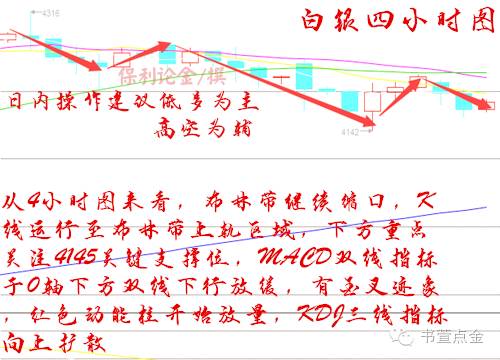 从4小时图来看,布林带继续缩口,K线运行至布林带上轨区域,下方重点关注4145关键支撑位,MACD双线指标于0轴下方双线下行放缓,有金叉迹象,红色动能柱开始放量,KDJ三线指标向上扩散,中长期仍然以震荡上行为主,日内操作建议低多为主,高空为辅。