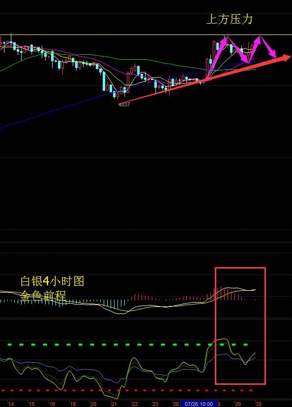 日线技术面看空。周线本也是空头信号强烈的,因美联储会议影响拉升了一波,促使了技术面有了一些受牵制的影响,行情不可能一下子走完,白银前期回避情绪,导致和美元走同向,而现在也是避险情绪开始有了降温的迹象,行情也将会慢慢恢复到正常的市场中,而在本周的行情中,白银也是走了明显的箱体运作,周五白银日线价格突破20ma之后,短期转为多头,价格回抽确认20ma没有破位,行情整体保持高位蓄势的态势,日线观察5ma和20ma能否形成金叉走势,4小时图macd开始粘合,短期线上看震荡高位收尾也是意料之事;那么,综合因素和技术面,金色前程认为下周预计先震荡上行,然后会有一个消化行情的机会,才能更好的走大空头趋势;(小多大空)还是以高空为主。
