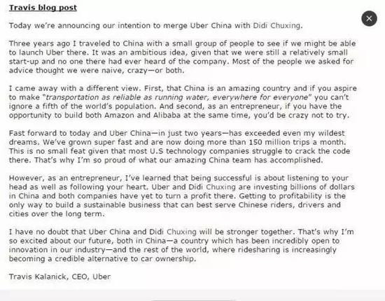 “你知道滴滴和Uber合并了吗?”下午6点,36kr记者打上了一辆棕色的马自达,询问司机时,对方露出了一脸懵住、不敢相信的表情。今天下午5点,在经历了两周的反复传言和辟谣--先是由彭博等海外媒体传言双方在商谈、由滴滴副总裁、投资人和公关部门出面否认、Uber中国副总裁柳甄否认,再出现已经合并的传言,并传出Uber创始人发的合并通知邮件,双方再辟谣后--滴滴出行终于发布了官方声明,公告标题叫做“滴滴出行收购优步中国”。