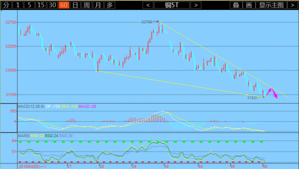 策略分析:在4月的CESCO会议上,铜矿业代表以削减成本而非大规模减产来应对铜价下跌的表态,基本给2016年全球铜矿供应定下了继续增长的基调,而3月智利、秘鲁的铜矿产量增速也对此作出了最直接的回应。日线图显示铜价三连阴,短期空头强势,中长期关注30000关口。小时图显示铜价从32769下行趋势依旧完美,周四早间给出短期高空思路的操作建议,大家是有目共睹的。