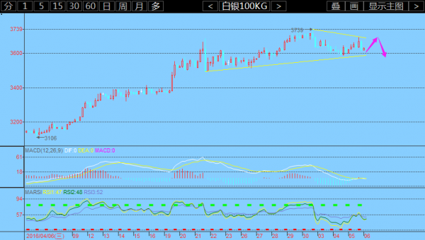 策略分析:目前商业套期保值者白银期货空单净仓位达极端高点。就在5周前的3月28日,所谓“聪明资金”商业套期保值者白银期货空单净仓位达十年以来最高点。日线图显示收出一根长上影阴线,价格目前维持在一个高位滞涨状态,中长期继续看回调。4小时图显示银价盘整呈小幅上行的趋势,配合量能来看,目前运行于三角区域,短期有反弹动能,操作上依然建议反弹做空。