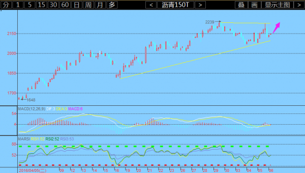 策略分析:昨天欧盘美国原油价格上涨主要受到加拿大野火肆虐,导致阿尔伯塔省石油生产中断的带动,布伦特原油则因利比亚战事升级而上涨。日线图收出一根上引阳线,MA5/MA10缠绕,上方有压力,但行情呈多头趋势上行,中长期关注前期高点2239一线,4小时图显示沥青于2067附近受支撑反弹,周三美盘因为阴包阳并收出巨阴K线,本人当时是短线看空,无奈周四晚间受重大利多消息面影响,原油上涨。操作思路没能及时分享给大家,还望见谅!