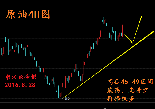 现在距离前期50美金一带已经很接近了,短线陷入了震荡,也在情理之中。但是我们仍需要留意的是周五冲高回落这个过程,前面几天日图也完成了调整,走的相对正常。然而周五冲高48.5之后日图收线在了47.3的位置,说明了一个问题,就是这波调整并没有结束,下周原油可能还将是继续以震荡为主,上周周评的策略给到46-50区间波动,那么现在我们把时间和点位重新规划一遍,但有一点始终不变,那就是我们昨天的文章中提到的一点,周线图39.2开始的上升趋势依旧存在,趋势上以低多为主,短线逢高做空下看。至于为什么还要震荡,因为距离趋势线支撑太远,高位得不到强有力的支撑,只能用震荡拉进距离来获取力量最后重新出新方向。现在让人最需要关注的一个点就是46.5美元一线了,这一线支撑不破,那么调整的力度肯定不大,上周有机会破掉,可惜差了一口气。趋势线支撑现在是45.4附近,如果周线继续下探46.0下方我们可以尝试做多,那么规划的区间就出来了,49-45区间震荡,周初在49.0一线下方看空,跌破46.5之后找机会做多。周一具体操作点位等明天开盘之后我们会给出。