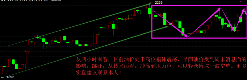 油价周一受到周末消息的影响开盘高开跳涨2.5%,从技术指标来看,冲高必回落,多头再次释放完,亚盘时段可博取轻仓高位空单,从技术面分析,早间高开没有打开上涨趋势,目前油价还是一个高位震荡,操作方面我建议根据重要压力位和支撑位操作,即高沽低渣。