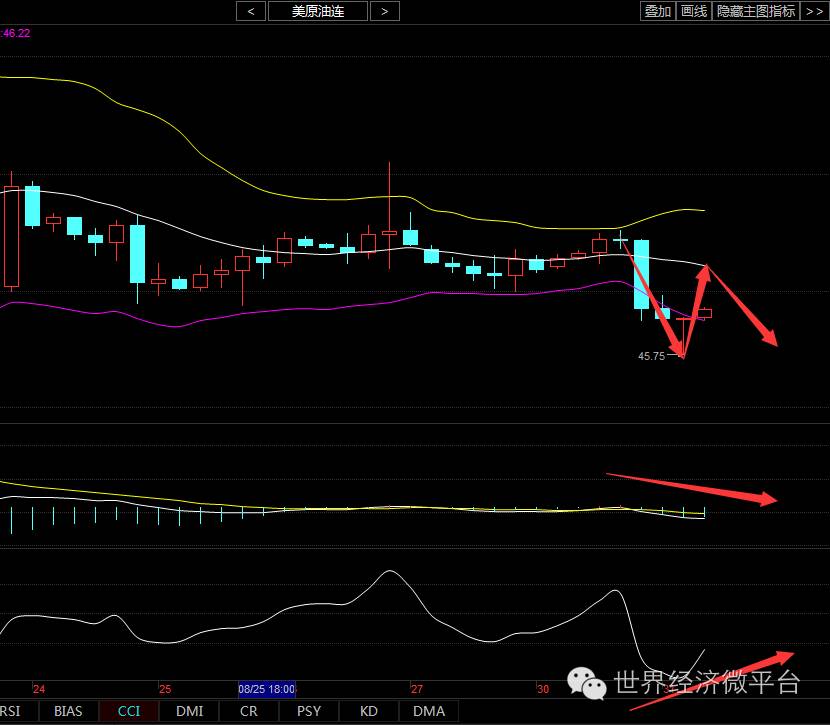 原油周二探高回落。亚欧盘守住47.0小幅震荡上升。美盘触及47.45一带承压。受累于美元走强和供应过剩忧虑。且伊朗称其石油产量将在年底达到制裁前水平。使得原油盘中快速走低。美盘稍晚时段。47.45一线承压后快速跌破46.60低点。尾盘延续探了个低点45.80出现。昨日晚间本人公众号策略给出47.50-47.40之间布局空单.最低46.25也是完美把握到行情,成功到达止盈点位。
