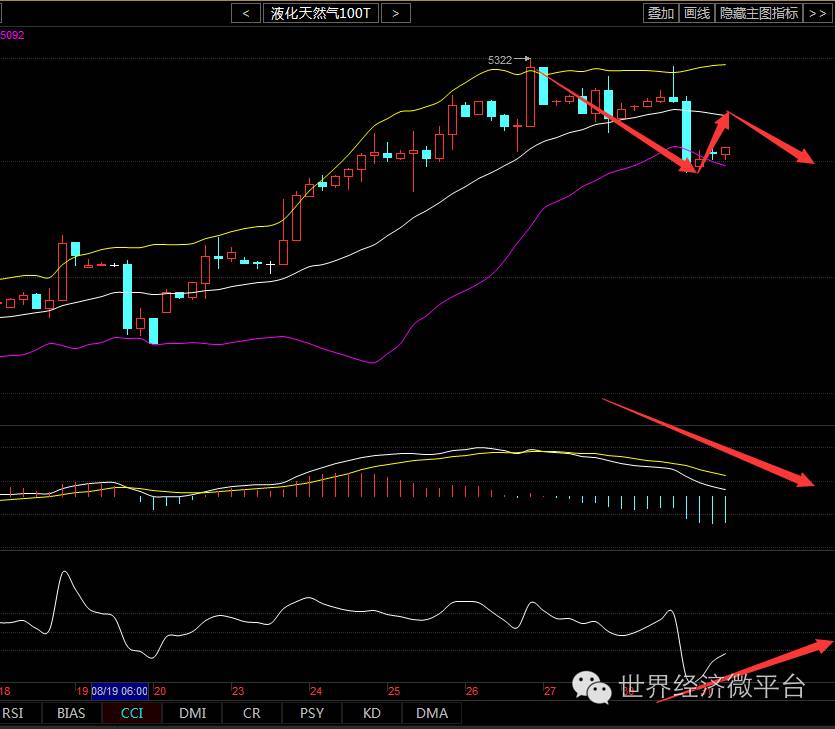 从四小时图上看布林带呈微微向下运行,K线运行于布林下轨通道,MA5/MA10均线交死叉于5210向下运行,布林带中轨依然于5200位置形成关键支撑,MACD指标于0轴上方交死叉运行,绿色量能放量,指标呈弱性;综合分析来看,天然气日线图上维持看多头走势不变,上行动能放量,KDJ三线整体向上发散,CCI自下向上逐渐进入常态区间。所以操作上建议反弹做空。
