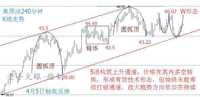 国际美原油周二上演“逆袭”,上行无休止的反弹,价格再次刺破四小时图中轨其成功站稳,短线来看仍然受到ma60日均线(48美元)压制,始终未能有效突破,但在金手火眼看来强势多头突破也只是时间上的问题,结合附图指标macd来看,金叉形成,红色动能柱初现毛头,有待放量;rsi三线聚拢交叉向上延伸,一旦价格有效破位,而前期的高点(46.07美元)也将是我们再次触摸到,故此也将是我们进场的绝佳时机。