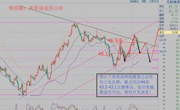 原油,上周周评分析我们预期本周能源市场将是一个多空反复博弈,走势复杂的时间节点。首先,43.0一带两处方向的选择,第一破低探底42-41.5之间筑底上涨;第二,43.0一带直接企稳,带动油价的直接反弹上攻。其次,43.0之外,还有45.1一线的多空博弈点,向上突破则继续测试46.5、47.5甚至是48.4/5高位压力;反之则继续受压,向42之下价格进行回撤整理。实际行情的运行,和我们预期相差不大,周一,43.0一带价格选择直接企稳上涨,45.1压力位置被周一沙特方面言论直接攻盘,最高触及46.5一线,日线上演冲高回落;周二,多空区间内争夺,日内形态成V型探底,日线阴十字;周三,价格小幅下探之后向上攻盘,受到API数据推动,日线中阳;周四,EIA数据创阶段性历史的降幅,带动油价向上跳涨,日内最高冲击47.75一线高位;周五,EIA库存数据短期效应消退,油价承压47.75/47.5压力日内走阴跌,最低45.56,日线高位大阴灭大阳。整体来看,本周五个交易日,走势均不平凡,基本面消息的纷纷参战,技术面走势繁杂无常,最终周线收取上影小阳线。