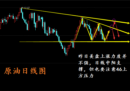 原油,日线如期而至的连阳上升,顺势看涨再下一城!昨日亚欧盘持续震荡横盘,技术面企稳上升形态,行情直接等待基本面数据的指引。数据利多原油,技术面配合基本面认准方向看拉升,昨天我们文章中也提示数据利多就做多,不过昨晚行情还是不够给力,多空反复震荡后凌晨再见新高,好在今天已经到达45.82!今日还是要顺势做多。前面明确强调,日线报收长下影阳柱,见底回升的形态,注意破位刷新低42.7一线开始企稳上升!下方不断测试支撑有效,蓄势待发的行情,日线中阳对今天行情提供支撑。操作上,今日接着顺势做多。