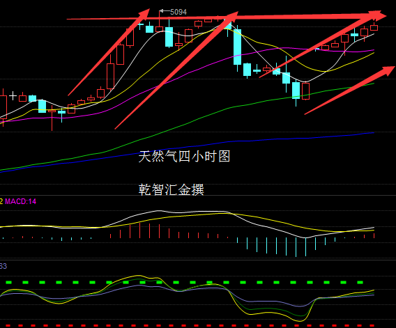从日线来看,均线系统上行排列,K线价格一路震荡走高,副图指标MACD金叉有粘合趋势,红色动能不断缩量,KDJ指标向下发散;四小时图来看,5、10日均线触及60日均线后迅速反弹向上,副图指标MACD死叉粘合,绿色动能柱不断缩量,随机指标KDJ向上发散运行,综合来看,天然气目前多头强势,操作上乾智建议以回调做多为主。