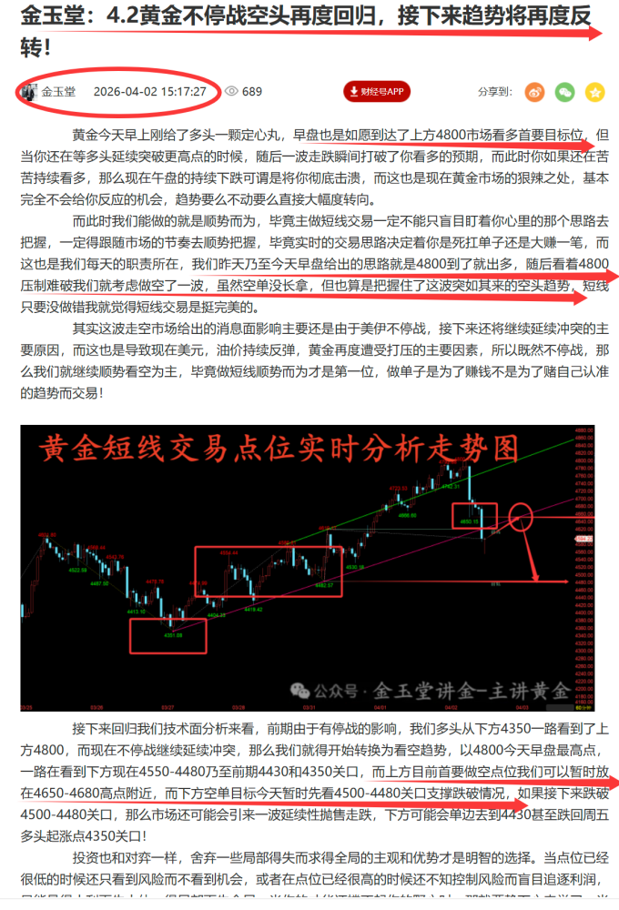 张尧浠:高油价与高通胀时代来临?金价预在乱局之中震荡上行 上交易日周四(4月2日):国际黄金遇阻回落收跌,特朗普全国讲话并未让市场相信战争即将结束和霍尔木兹海峡问题会得到解决,而是加剧冲突,表示未来两到三周,将继续对伊朗予以沉重打击,提振原油及美元大幅走强,打压金价一度跳水近250美金,但最终触底回升,美盘时段,伊朗方面称正在与阿曼起草霍尔木兹海峡通行协议,减弱了通胀担忧。使其金价仍收于100日均线上方,暗示多头仍占据一定优势,后市仍有再度看涨反弹的预期。 具体走势上,金价自亚市 开于4757.97美元/盎司 ,先行走强录得 日内高点4800.19美元, 之后遇阻回落,并连续跳水下行,于14