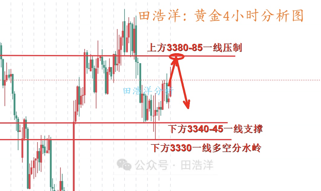 黄金今天早间我们就给了3340-43一线做多的思路,截止目前完美符合本人行情策略分析,黄金早间3375一线回落,直接目前最低回调至3341一线,在3342一线我们实盘及时给了做多策略,下方3340是前期支撑位,所以做多没有问题的,只少可以博取一波反弹利润,如果你目前操作不理想,希望田浩洋能让你的投资少走弯路,欢迎前来沟通交流! 从4小时分析来看,下方短期支撑关注3340-43一线关口,重点关注3330一线位置也是短线多空强弱分水岭,上方压力关注3380-85附近,整体依托3330-3385区域高空低多循环参与主基调,中间位置一律多看少动谨慎追单,耐心等待关键点位进场。具体操作策略我会在盘中提