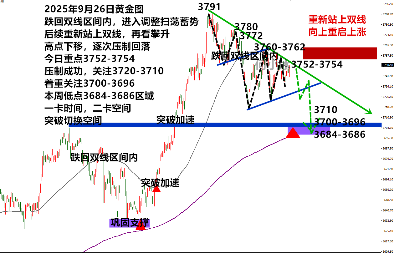 何小冰:金价继续调整修正,3755是今日关键 前两日我们假设3791为调整的高点, 看整体价格进入到调整修正的状态,现在从价格来看,符合我们的预期和猜想 所以后面的调整修正的过程中,我们需要着重关注调整的空间以及防守线位置 而调整空间时大时小,空间幅度在40-80美元左右,所以将这个主要作为辅助, 把重点和关键放在定防守线上 然后根据防守线来进行下一步的空间切换 现在的两个防守线位置,一个是3791形成的压制线位置,一个是双线上轨位置 昨日叠加在3760-3770区域,价格三次确定此处的阻力后承压下跌找寻3722范围 随着时间的推移,现在这两个位置进行 靠拢叠加在3752-3754区域 此处