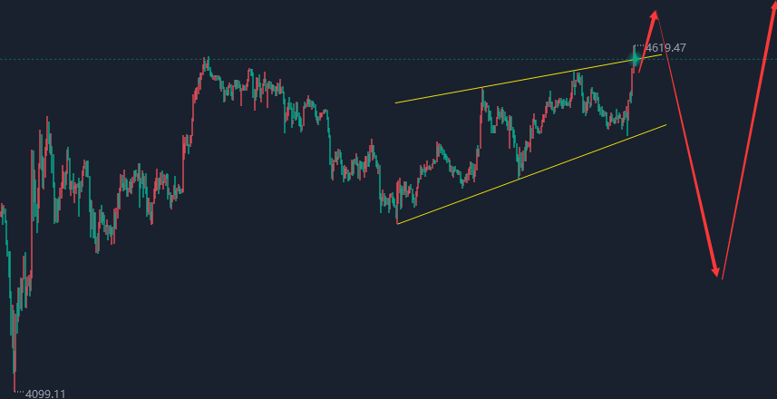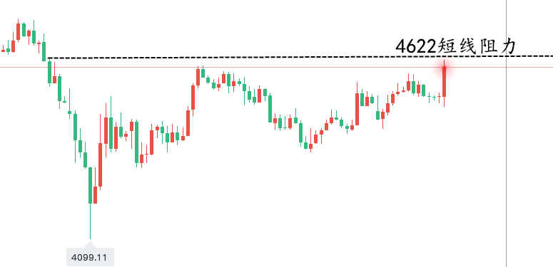 对于投资者来说,黄金投资的核心,从来不是赚多少,而是守住多少,风控就是守住本金、守住底气的关键。很多人因为心软、因为侥幸,忽视风控,盈利时重仓博弈,亏损时死扛不止损,最后一次亏损就回到原点,所有的努力都付诸东流。风控不是束缚,而是保护,是在行情波动中,给自己留一条退路,是在贪心作祟时,给自己泼一盆冷水。无论行情好坏,无论盈利与否,都要把风控放在首位,严控仓位、坚决止损,不抱侥幸心理,不冒无谓之险,守住风控底线,就是守住自己的本金,守住自己的努力,守住自己在投资路上的底气与从容。 周二早盘,国际黄金延续近期反弹态势,小幅上涨后成功突破前期震荡区间上沿4603关键点位,最高触及4619.47,展