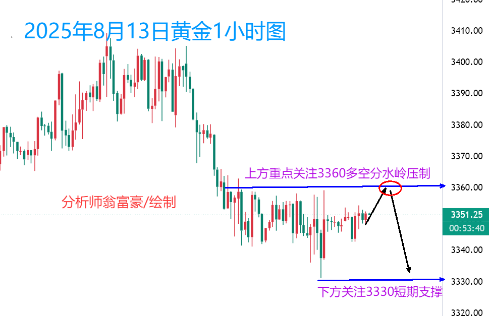 交易之道,所求当为“长期稳健之盈利”,而非寄望于单次交易的暴利。收益应是遵循交易系统整体概率的“被动所得”,而非凭借一时运气的偶然之获。以自身风险承受范围内的仓位去追逐适度的利润,如此方能使收益曲线平滑上扬,避免大起大落。以下为近期实盘布局可观摩! 8.13黄金分析 金价周二微涨,在美国通胀数据维持了美联储降息预期之后,人们的注意力转向了本周将公布的其他关键经济数据。技术面当前金价整体走势相对偏弱,短线如不能进一步突破上方3360关口压制,则金价仍旧面相下行风险,不过在跌破30之前,行情依旧可能在区间来回震荡。 操作建议:早盘冲高至3355--3360一线高空,目标看3340--3335附近