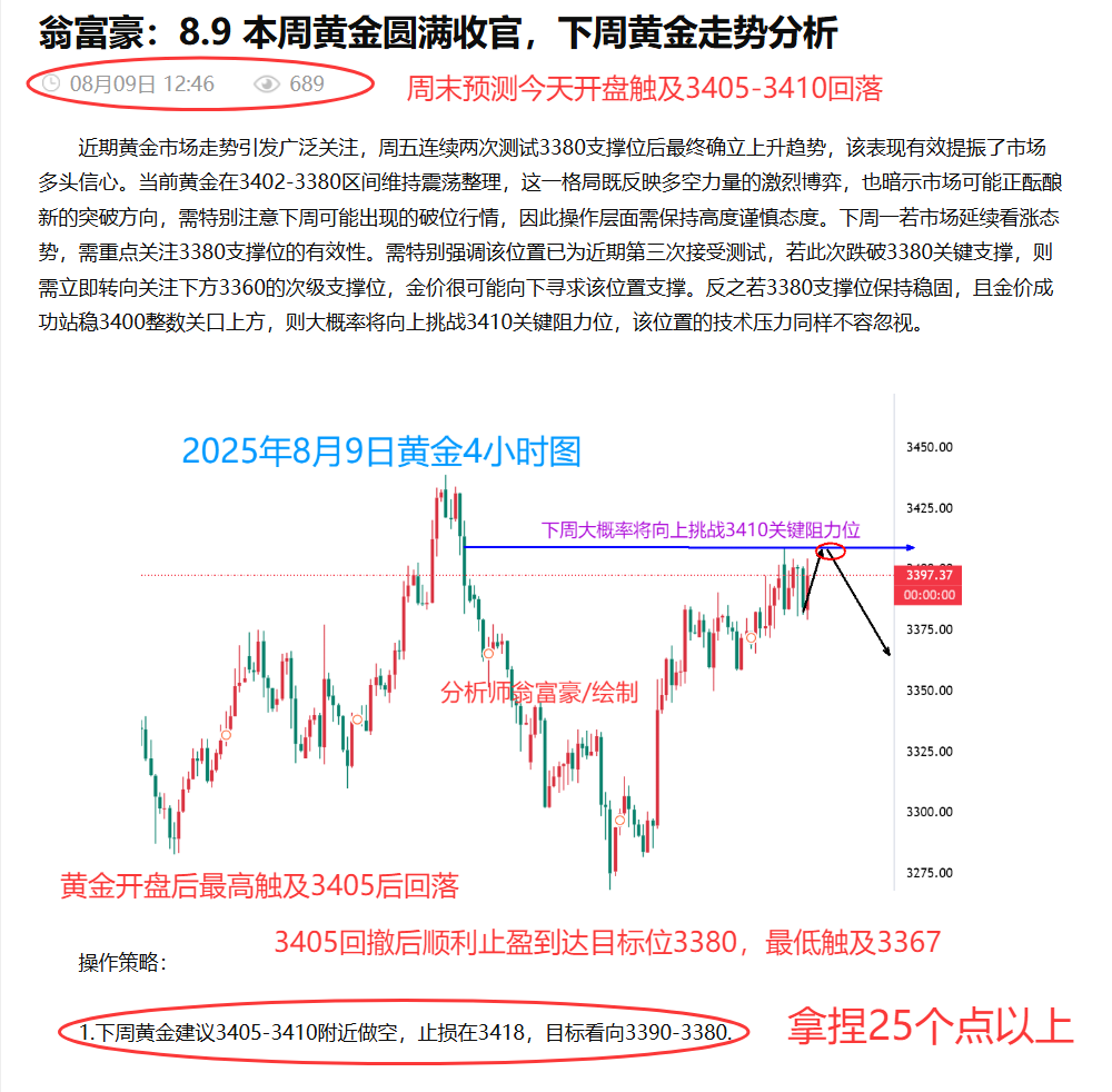 周末本人全网公开发布博文预测今天开盘黄金冲高3405-3410回落,最终开盘后黄金如期在3405回落,一路下行完美到达目标点位,最低触及3367一线。早间再度冲高后承压回落,不仅跌破3380关键支撑,更一度下探至3370下方。值得注意的是,连续两个交易日早间冲高后均遭遇强阻力,且多次冲击3400整数关口未能成功站稳,这表明市场需要一个短期回撤蓄能的过程——正如"下蹲之后才能跳得更高"的市场规律,但此现象并非意味着牛市终结或上升趋势终止,当前仅是宽幅震荡进入新阶段,行情出现大幅下跌仍存在一定难度。 空单策略 :鉴于冲高回落已跌破周五低点,后续再度走强的可能性显著降低,可借助反弹至3392~33