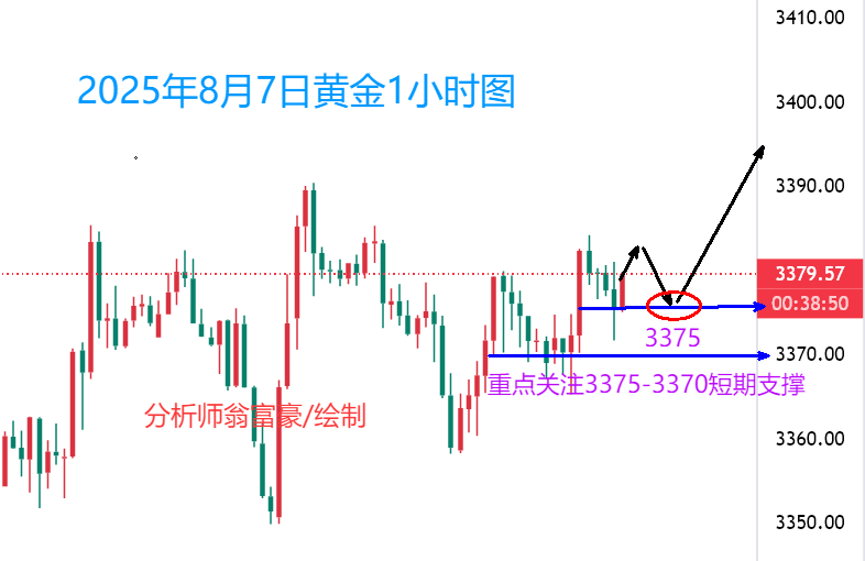 2025年8月7日星期四 黄金区间震荡调整,整体仍强势!但需注意上方关键位表现! 黄金日K图 连续几天的震荡调整,行情也是比较磨人,再次强调耐心等待的重要性,耐不住忍不住就容易来回止损,把成本损耗在反复的行情中,真正的行情出来时却又没有合理的成本再去布局,甚至扰乱整个系统的执行。 日间区间关键位置明显:3360至3385,90区间,日间北上选择尤其注意3385突破表现,下方3360依旧是北上关键支撑,一旦至此需注意变向风险。 黄金4小时K RSI整体仍在偏强势状态,结合最近收线阳吃阴,仍是低多选择为主概率较大。 黄金1小时K 此周期循环震荡上行,低点抬高依次,同样是强势表现,还是主多。但温馨