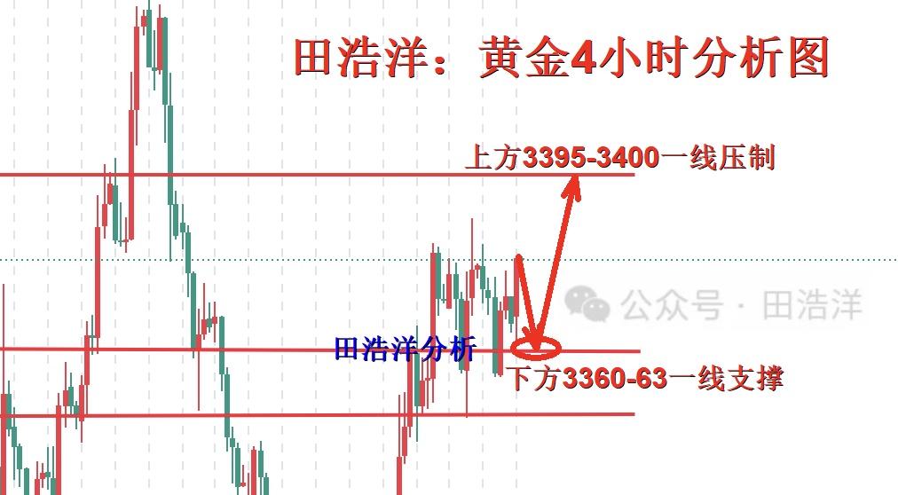 黄金本周以来低点不断上移,高位不断上升,这就说明多头一直在进行中,我们多次把握住回踩做多的进场位置,也在高位把握住回调的进场空的位置,相信关注我的朋友都看得到,黄金今天我们关注上方3395-3400一线关口压制,回踩我们继续找机会做多,毕竟多头依旧是重要趋势。如果你目前操作不理想,希望田浩洋能让你的投资少走弯路,欢迎前来沟通交流! 从4小时分析来看,今日我们上方关注3395-3400一线关口压制,下方重要支撑关注3360-63一线,日线级别企稳此位置上方继续保持回踩低多顺势看涨节奏不变,日线级别未跌破3350关口之前逆势空单需谨慎。具体操作策略我会在盘中提示,及时关注。 黄金操作策略: 1、