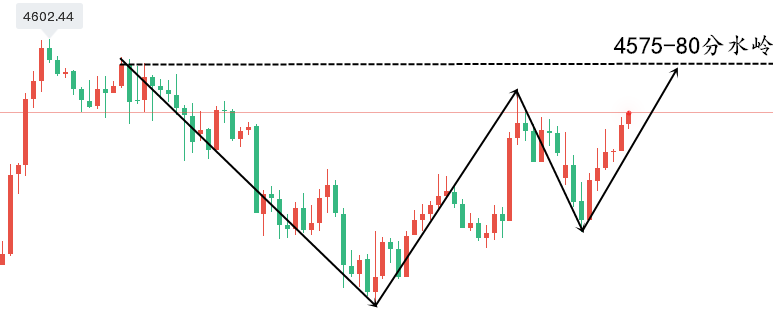 何小冰:扫荡上涨的风还在继续吹,守低是关键破高是重点 上周五,熬了一整天,最后美盘时刻发力,启动上涨,完成超100美元的上涨,早盘一气呵成上涨超100美元后,又是差不多70美元的调整力度,反复巩固4410上下的支撑,美盘启动发力,冲刺4555,尾盘高位徘徊 今日周一早盘,又一个深蹲100美元左右 ,4515下探至4419,确定支撑后开始稳步上涨,层层突破 第一个位置4555 (上周五高点), 第二个位置4580上下 (绿色趋势线和上周反复确定阻力范围), 第三个位置也是关键的4640-4660区域 (叠加多重阻力) 关键阻力点,就是以上三个 关键支撑点,定一个原则,便是守低,守低逐次看向上攀